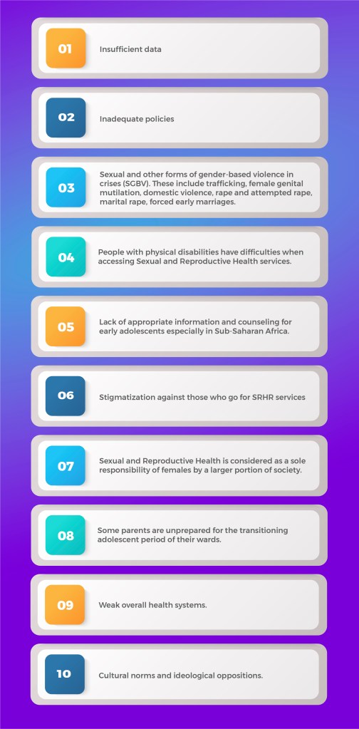 Sexual and Reproductive Health and rights promote gender equality and give minority groups such as the disabled and the LGBTQI+ the opportunity to access sexual and reproductive health services. They also help in slowing down the spread of HIV/AIDS, stabilizing population growth, and reducing poverty. However, in the process of promoting Sexual and Reproductive Health Services, there are some challenges which affect their provision, especially for adolescents across the world. These include: