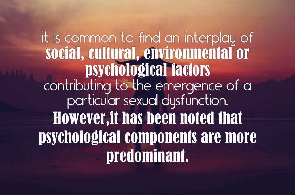 Traditionally, sexual dysfunctions were approached and treated as though they were diseases, even though the term craftily avoids mention of it as such. This is not to say that there are not sexual dysfunctions that are purely biological. However, over time, knowledge of sexual health has evolved, and more interdisciplinary approaches (biological, cultural environmental, social, and psychological) have been applied to understanding the complexities of human sexuality. In many cases, factors that are not biological, that cause sexual dysfunctions are inseparable. As such, it is common to find an interplay of social, cultural environmental or psychological factors contributing to the emergence of a particular sexual dysfunction. However, it has been noted that psychological components are more predominant.