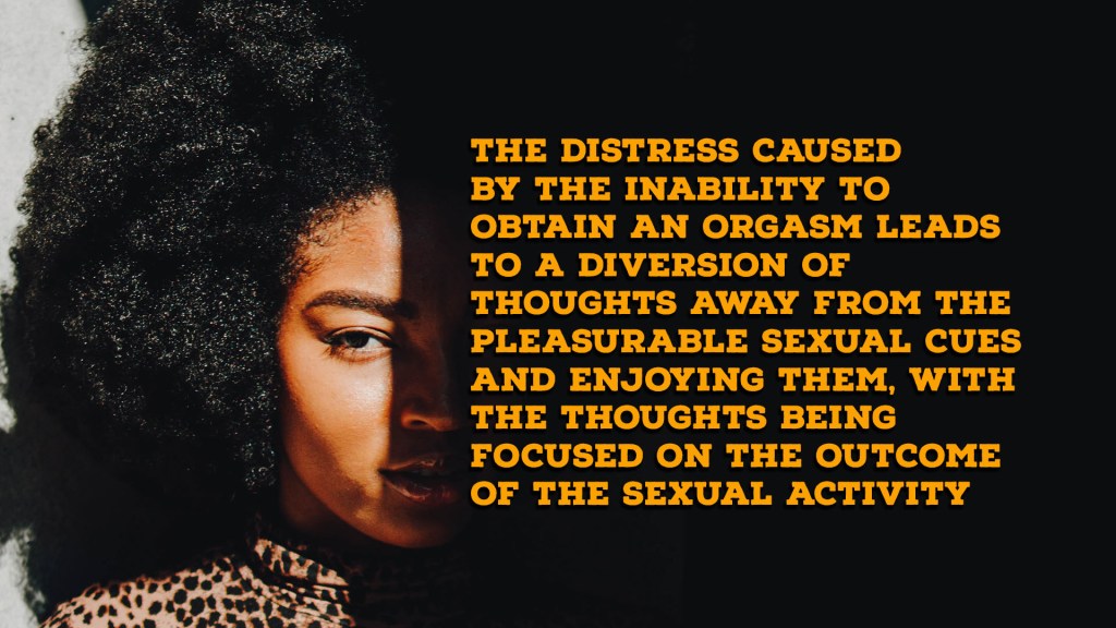 However, unlike males with erectile disorder, females express comparatively lower emotional concerns about their inability to attain orgasm. Similar to the erectile disorder, psychological explanations for this condition border on the cognitive appraisal and emotions that follow the experience of a single or few episodes of inability to attain orgasm. A woman with this condition may measure a successful sexual encounter by the attainment of orgasm and be distressed when she does not experience it. The distress caused by the inability to obtain an orgasm leads to a diversion of thoughts away from the pleasurable sexual cues and enjoying them, with the thoughts being focused on the outcome of the sexual activity, i.e., orgasm.