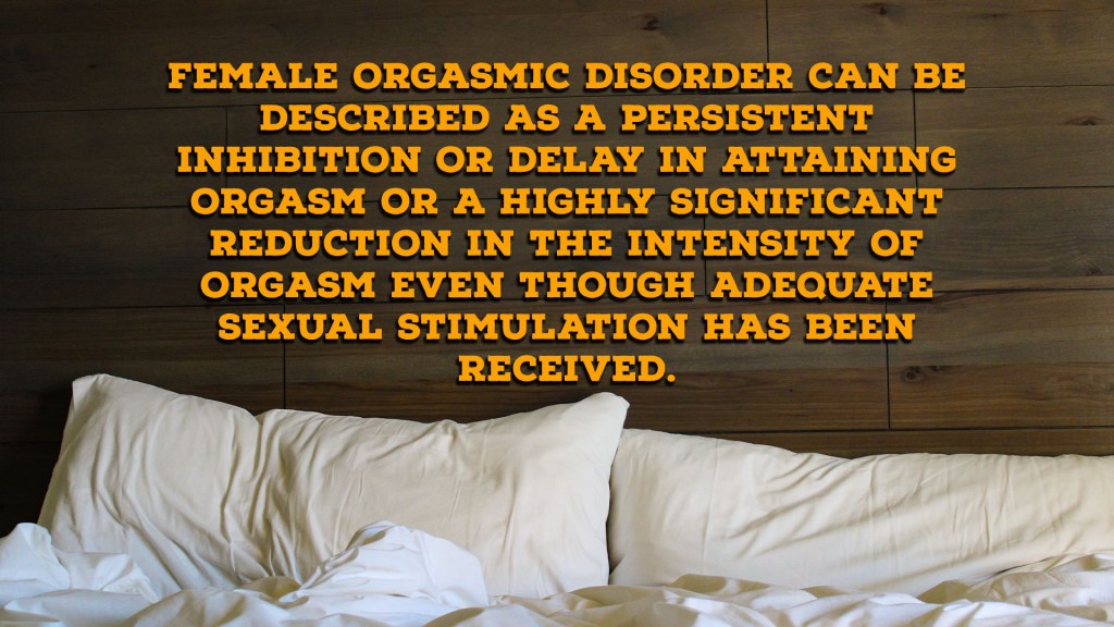 Female Orgasmic Disorder can be described as a persistent inhibition or delay in attaining orgasm or a highly significant reduction in the intensity of orgasm even though adequate sexual stimulation has been received.