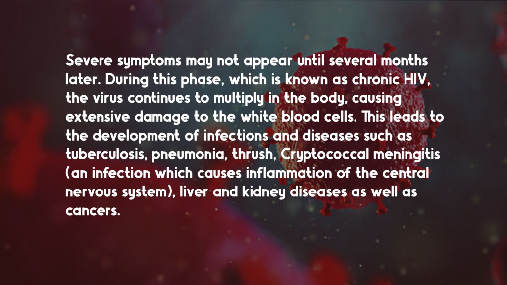 These symptoms may be experienced in mild to moderate levels, however, the viral load of the infected person at this stage is very high and infectious. Severe symptoms may not appear until several months later. During this phase, which is known as chronic HIV, the virus continues to multiply in the body, causing extensive damage to the white blood cells. This leads to the development of infections and diseases such as tuberculosis, pneumonia, thrush, Cryptococcal meningitis (an infection which causes inflammation of the central nervous system), liver and kidney diseases as well as cancers.