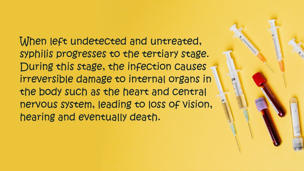 Syphilis develops in stages and symptoms tend to differ with each stage. These stages are divided into primary, secondary, latent and tertiary. During the primary stage, symptoms appear 10 – 90 days after exposure. An infected person at this stage generally develops painless sores around the genitals, anus, or mouth. These sores are usually less than 2 cm in length and circular shaped in nature. The sores may go away naturally, but without treatment, the infection progresses, leading to more health complications. During the secondary stage, which occurs 2 weeks to 6 months after exposure, the infected person develops fever or headaches and rashes every so often on their hands and soles of their feet. Such individuals may also experience swollen lymph nodes around the neck. Both the primary and secondary stages tend to be mild and may go unnoticed. During the latent stage, which occurs 12 – 24 months after exposure, the infected person will show no symptoms. Such a person may live so many years without any possible symptom of the infection. When left undetected and untreated, syphilis progresses to the tertiary stage. During this stage, the infection causes irreversible damage to internal organs in the body such as the heart and central nervous system, leading to loss of vision, hearing and eventually death.
