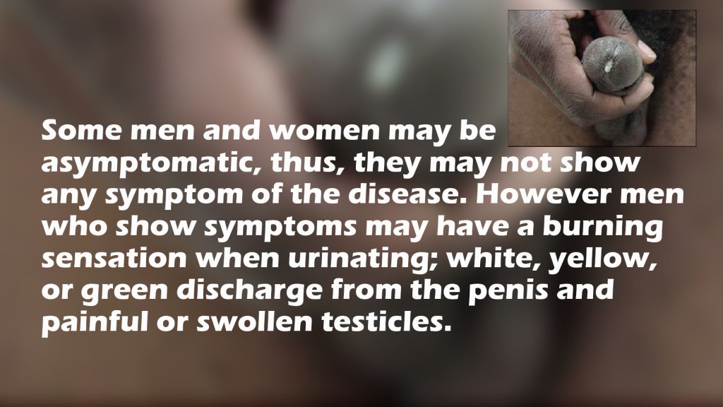 Some men and women may be asymptomatic, thus, they may not show any symptom of the disease. However men who show symptoms may have a burning sensation when urinating; white, yellow, or green discharge from the penis and painful or swollen testicles.
