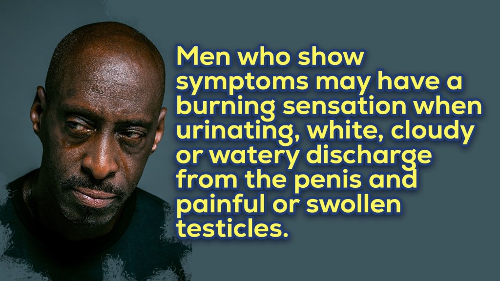Research has shown that 90% of women and 70% of men with chlamydia are asymptomatic, thus, they may not show any symptom of the disease. However, men who show symptoms may have a burning sensation when urinating, white, cloudy or watery discharge from the penis and painful or swollen testicles.
