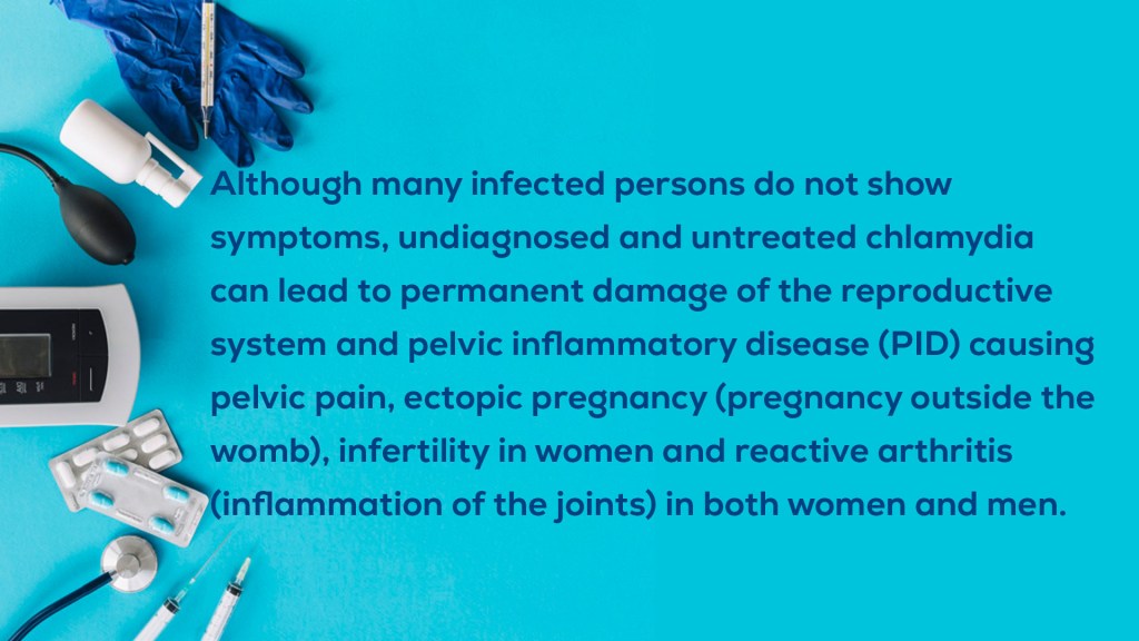 Although many infected persons do not show symptoms, undiagnosed and untreated chlamydia can lead to permanent damage of the reproductive system and pelvic inflammatory disease (PID) causing pelvic pain, ectopic pregnancy (pregnancy outside the womb), infertility in women and reactive arthritis (inflammation of the joints) in both women and men. During pregnancy, it can lead to babies born with conjunctivitis which can cause permanent vision damage if untreated.