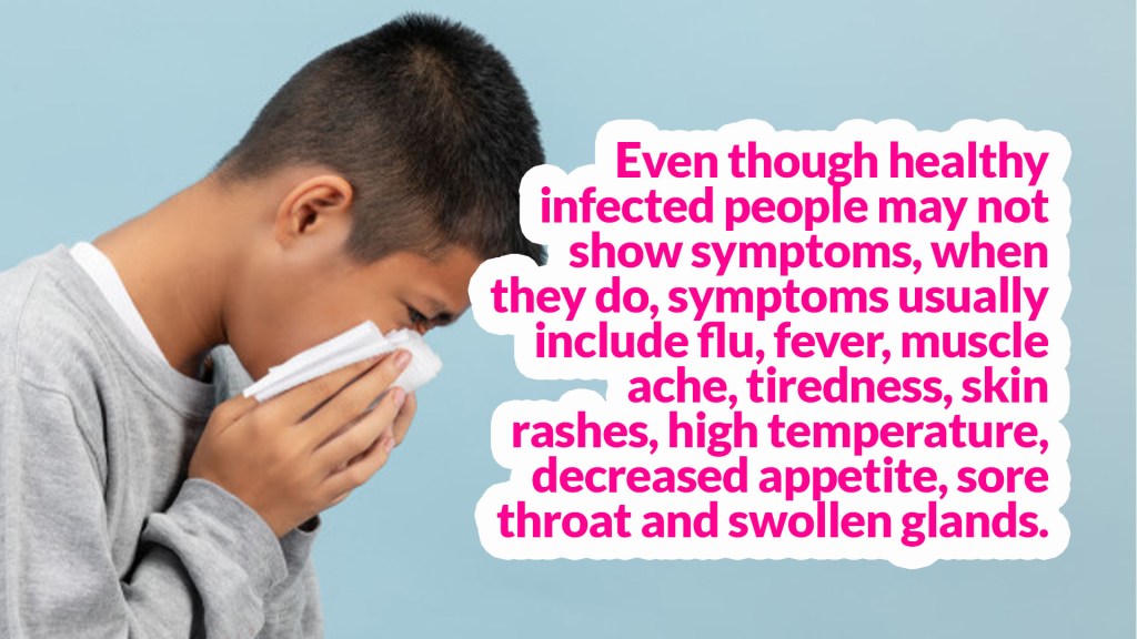 Even though healthy infected people may not show symptoms, when they do, symptoms usually include flu, fever, muscle ache, tiredness, skin rashes, high temperature, decreased appetite, sore throat and swollen glands. These symptoms usually go away naturally without any treatment within 3 weeks of onset. Newborns with the virus are often born prematurely, with a low birth weight. Such babies may have developed a small brain, which is scientifically called microcephaly, and other serious health complications like seizures, mental retardation, deafness and death. Infected persons living with AIDS or going through cancer treatment can become blind, may develop pneumonia, liver inflammation ulcers, intestinal obstruction resulting in jaundice, abdominal pain and bloody diarrhea.
