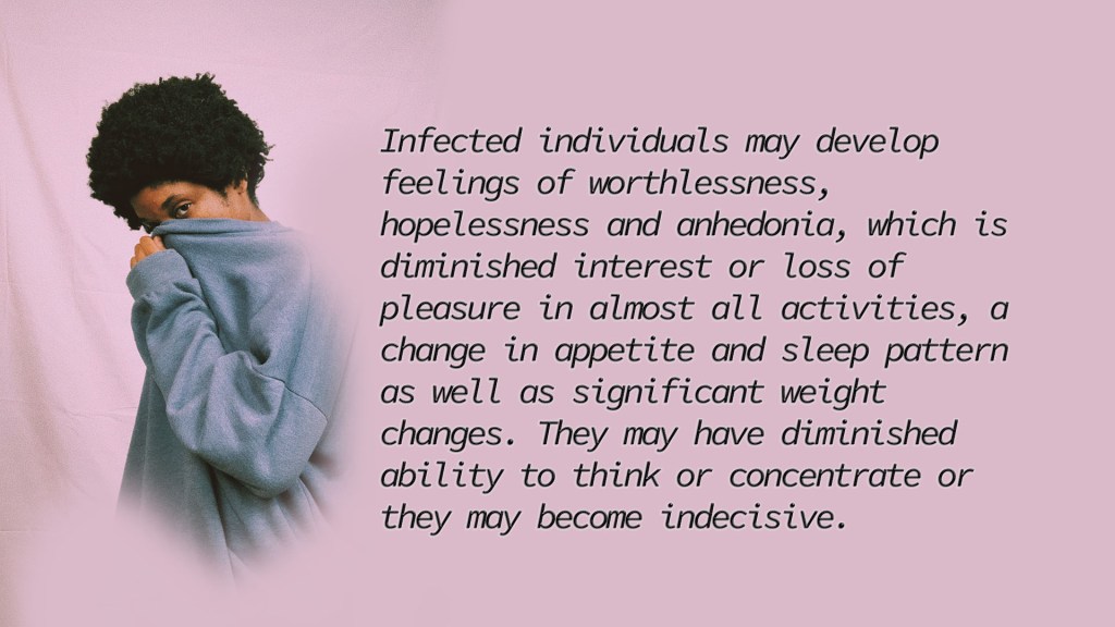 STIs/STDs affects the mental health of infected individuals in complex ways. When individuals find out they have STDs, they usually feel bad about themselves often due to guilt, shame and stigma. These feelings can result in depression, stress, anxiety, and other mental health problems. Indeed, researchers and clinicians have reported that having a diagnosis like HIV and any other STD can be a stressor and a precipitating factor for depression and anxiety, which may require counselling for patients to come to terms with it. Infected individuals may develop feelings of worthlessness, hopelessness and anhedonia, which is diminished interest or loss of pleasure in almost all activities, a change in appetite and sleep pattern as well as significant weight changes. They may have diminished ability to think or concentrate or they may become indecisive.