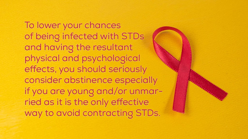 Due to these lasting effects of untreated STDs/STIs, it is recommended that every sexually active person should do a routine STI/STD test to know his/her status and get early treatment. To lower your chances of being infected with STDs and having the resultant physical and psychological effects, you should seriously consider abstinence especially if you are young and/or unmarried as it is the only effective way to avoid contracting STDs. If you cannot abstain, then for your safety as well as that of your sexual partner, you need to embark on the following measures: