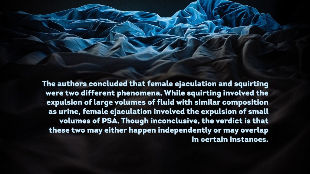 To answer this question, let’s take a look at a popular modern research. Samuel Salama and his colleagues in 2015 conducted a study to analyze the biochemical nature of the fluid that was expelled during sex. In the study, 7 women who had no gynaecological abnormalities, and who all reported noticing the expulsion of fluid during sex were recruited. They were asked to produce urine samples, and then urinate to empty their bladders. They then had an ultrasound scan to demonstrate that the bladders were indeed empty. The women were sexually stimulated either by their sexual partners or by themselves with or without the aid of sex toys until they were sufficiently aroused. Condoms were used in the cases of sexual intercourse to prevent the genitals from being contaminated with ejaculate. As soon as the participants reported feeling sufficiently aroused, they underwent a second ultrasound scan which showed that their bladders were filled. After the second ultrasound scan was completed, sexual stimulation continued until the women squirted. The expelled fluid was collected into plastic bags, and a third ultrasound was done which showed that the bladders were empty. When the collected fluids were analyzed biochemically, it was found that for two of the women, the fluid was mainly urine. For the other 5 women, the fluid which was also mainly urine was laced with prostate-specific androgen (PSA) coming from the Skene’s gland. The authors concluded that female ejaculation and squirting were two different phenomena. While squirting involved the expulsion of large volumes of fluid with similar composition as urine, female ejaculation involved the expulsion of small volumes of PSA. Though inconclusive, the verdict is that these two may either happen independently or may overlap in certain instances.