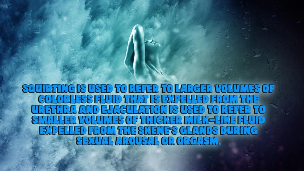 Urological examinations have suggested that the fluid contains prostate-specific androgen (PSA). Some researchers have found that about one-third to two-thirds of women have prostate tissues in a structure known as the skene’s gland and substances produced by this gland are found in the fluid, suggesting that the gland plays a role in the production of the fluid that is secreted during squirting. This gland is found to be connected by ducts to the urethra. By this explanation, we know that the skene’s gland is responsible for the production of this fluid. Now to what exactly it is; as stated earlier, squirting and female ejaculation are often used interchangeably. However, some researchers have suggested a difference in the two. Squirting is used to refer to larger volumes of colorless fluid that is expelled from the urethra and ejaculation is used to refer to smaller volumes of thicker milk-like fluid expelled from the skene’s glands during sexual arousal or orgasm.