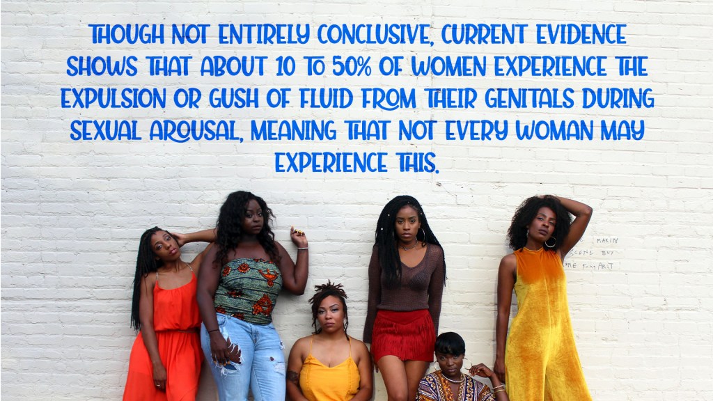 Though not entirely conclusive, current evidence shows that about 10 to 50% of women experience the expulsion or gush of fluid from their genitals during sexual arousal, meaning that not every woman may experience this. The quantity and nature of fluid gushed out has been found to differ too. While some women produced less than 5ml of liquid mostly somewhat milky or milky in appearance, other women are found to produce large volumes of clear liquid, enough to wet a bed and often more than 150ml. For those who have experienced squirting, there have been mixed reactions about the occurrence. Some women, mostly those with knowledge about squirting, feel excited and captivated, others, mostly those without adequate knowledge, feel ashamed and worried about the occurrence mainly because they think they peed during sex.