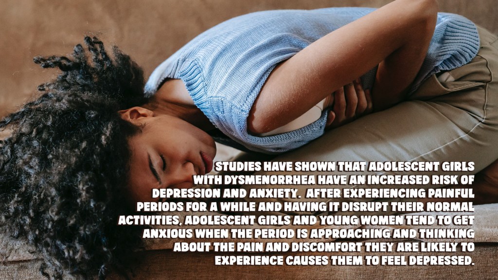 Dysmenorrhea is a condition associated with PMS. It is a medical term for painful menstrual periods or menstrual cramps. Some young girls and adolescents experience very painful periods which make them unable to perform their normal activities. The pain usually begins one or two days before you get your period or when bleeding actually starts. You may feel pain ranging from mild to severe in your lower abdomen, back or thighs. Pain can typically last 12 to 72 hours, and you might have other symptoms, such as nausea and vomiting, fatigue, and even diarrhea. Apart from these physical effects, there are associated psychological effects. Studies have shown that adolescent girls with dysmenorrhea have an increased risk of depression and anxiety. After experiencing painful periods for a while and having it disrupt their normal activities, adolescent girls and young women tend to get anxious when the period is approaching and thinking about the pain and discomfort they are likely to experience causes them to feel depressed.
