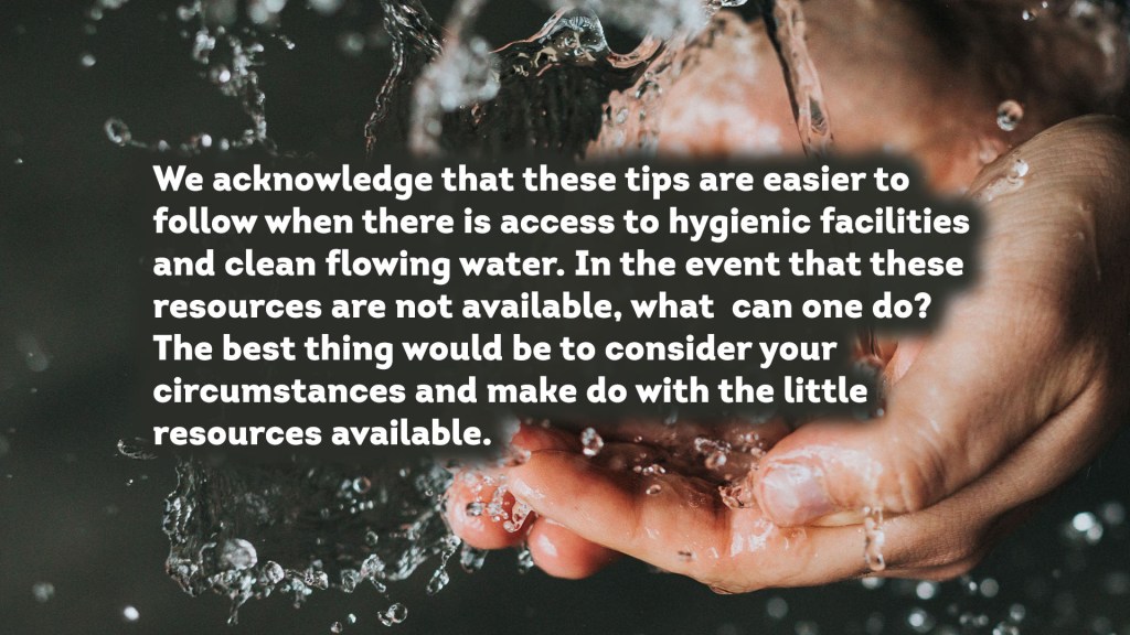 We acknowledge that these tips are easier to follow when there is access to hygienic facilities and clean flowing water. In the event that these resources are not available, what can one do? The best thing would be to consider your circumstances and make do with the little resources available.