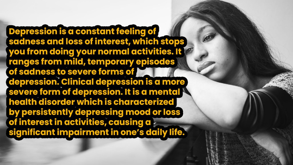Depression is a constant feeling of sadness and loss of interest, which stops you from doing your normal activities. It ranges from mild, temporary episodes of sadness to severe forms of depression. Clinical depression is a more severe form of depression. It is a mental health disorder which is characterized by persistently depressing mood or loss of interest in activities, causing a significant impairment in one’s daily life. Some people experience this condition once in their lifetime while others experience it several times in their life.